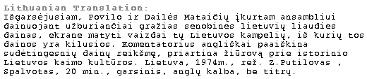 The Ethnographic Ensemble was founded by Povilas and Daile Mataitis to preserve the ancient rounds Sutartiniai and other polyphonic folk songs of old Lithuania. The beauty and importance of their work is widely acknowledged across the country. This colorful documentary features hauntingly-beautiful, archaic melodies performed in the regions of their origin and set against authentic traditional backgrounds. The narrator explains in English the significance of the more complex songs, and makes the historic Lithuanian peasant culture accessible to everyone.