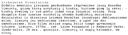 This moving portrayal of an experience understandable to us all the sense of reclaiming a distant heritage charts the odyssey of young Canadian-Lithuanians as they return to the mythic homeland where their parents were born. Absorbing the sights and sounds of a land at once so intimate and so foreign to them. Superb short performances by singers at the famous Rumsiskes National Park, and a classic poetry reading by renowned actor Laimonas Noreika are among the many special attractions. For those who have ever returned to their past, but even more so for those who have not, this film is a chronicle of a dream come true.