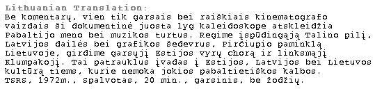 This documentary is a kaleidoscope of Estonian, Latvian, and Lithuanian sights and sounds that give a real sense of regional character. Without any commentary, it relies solely on music and expressive camera work to relay the many glimpses of Baltic culture. Among the varied elements shown are the impressive old castle in Tallin and the famous Estonian Men's Chorus; Latvian paintings and graphic art; the Lithuanian War Memorial at Pirciupiai, and Klumpakojis, a funny dance performed in clogs. This film will be of interest to anyone who doesn't speak a Baltic language, but is curious about the culture.