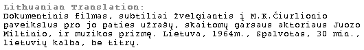 This subtle documentary focuses on the paintings of the famous composer-painter M.K.Ciurlionis, using his music and entries from his personal journal narrated by the famous Lithuanian actor Juozas Miltinis. The harmony of words and music works well to enchance the appreciation of Ciurlionis's fantastic art.