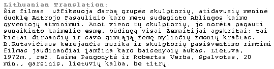 This film records the loving work of a team of sculptors who chose to pay an artistic homage to the neighbors and other countryman they lost when the village of Ablinga in Zemaitija, Lithuania, was burned to the ground during World War II. As one'sculptor explains, he wanted to capture the essence of the annihilated village, which he says was typical of the Zemaitija region: a bastion of hard-working people who loved the earth. The hauntingly-beautiful music arranged by B.Kutavicus and the quiet dedication with which the sculptors commemorate their loss makes this film a moving expression of the'severity of war.